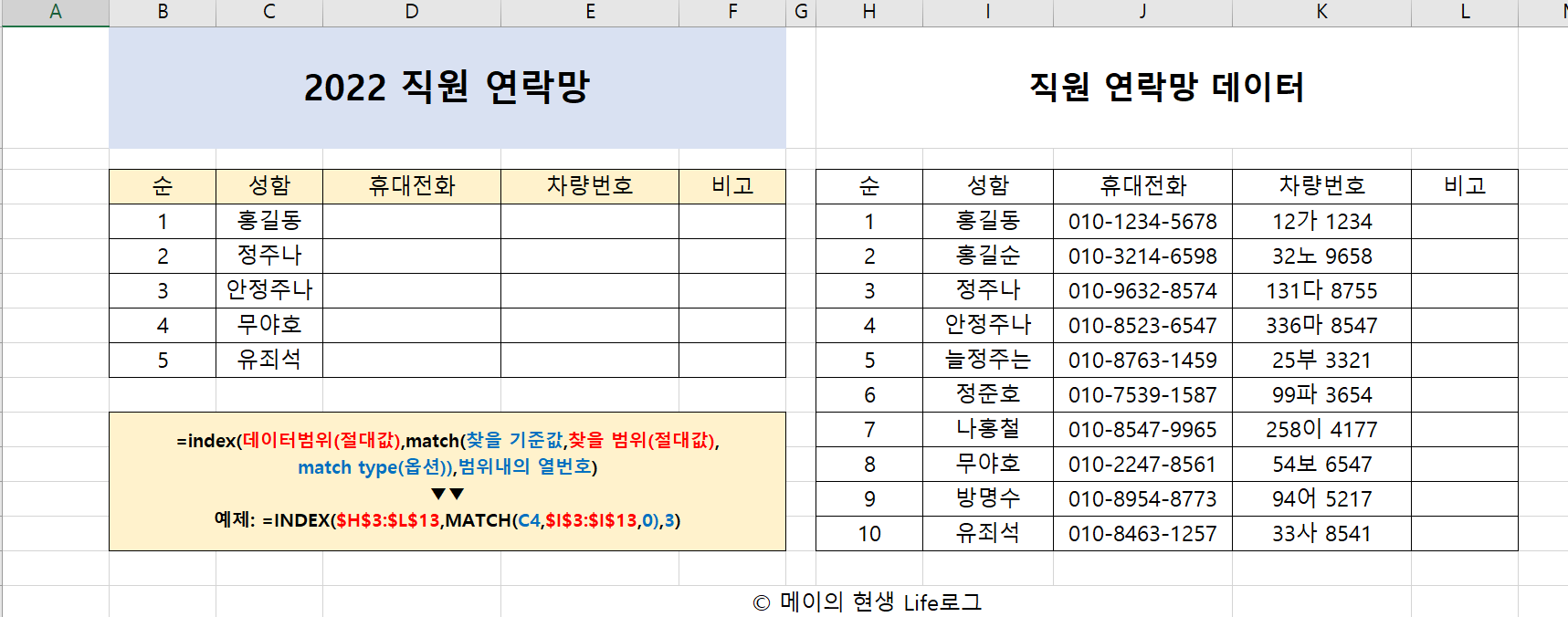 왼쪽이 값을 찾고자 하는 내용이고 오른쪽 내용은 직원들 연락망 데이터 입니다.
