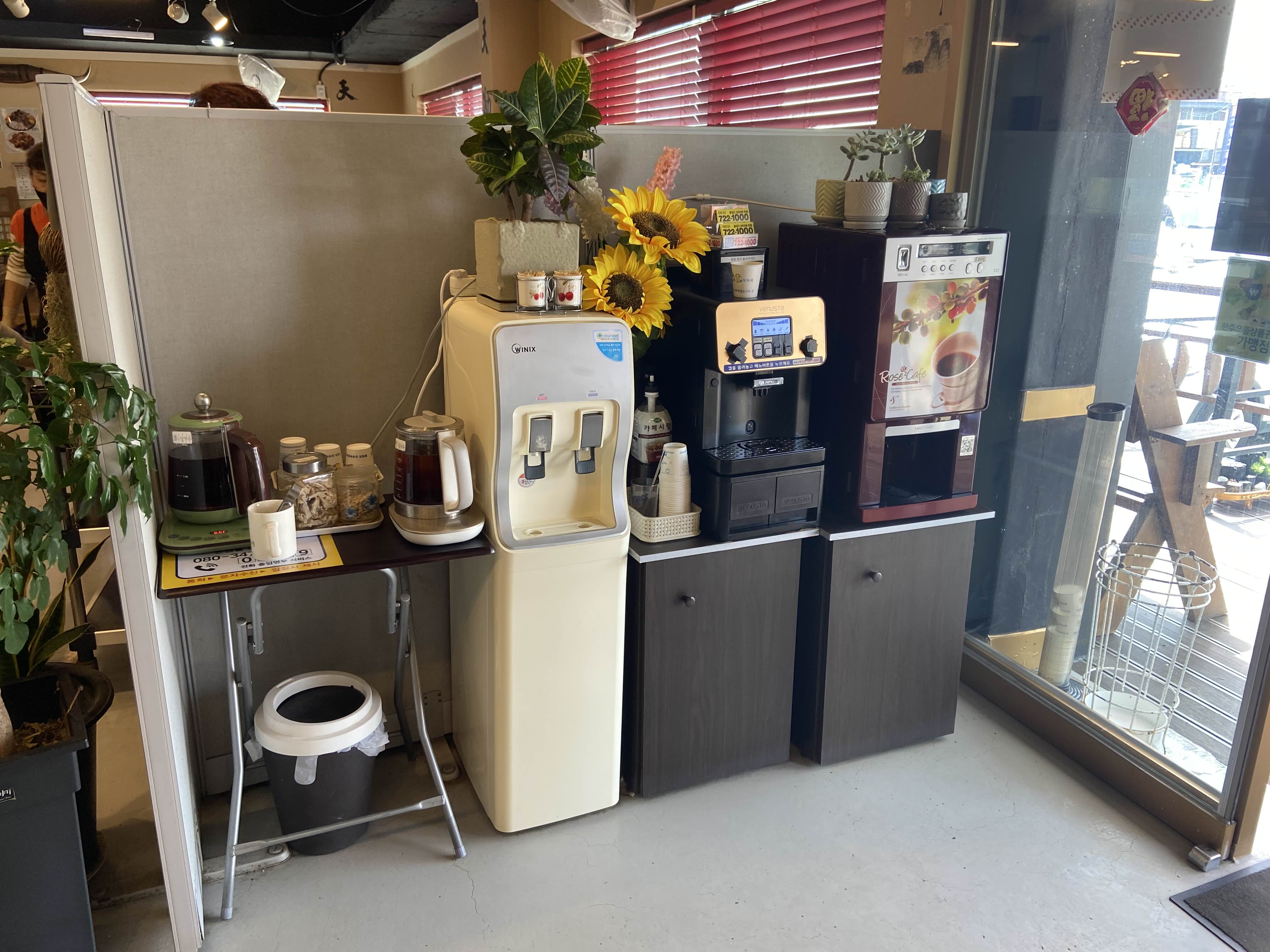 가게 입구 한 켠에 정수기와 커피머신이 있습니다.