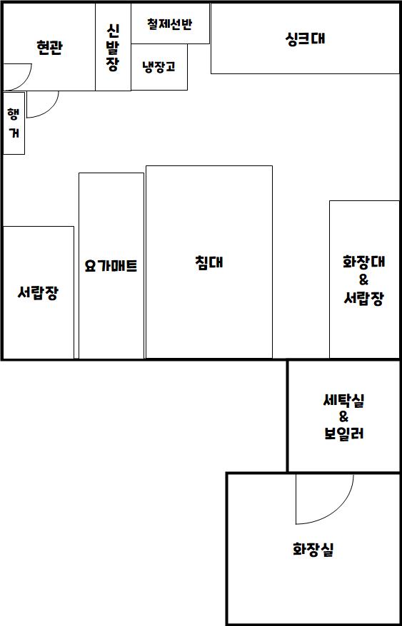 방 구조를 보면 싱크대 옆에 철제 선반이 하나 있습니다.